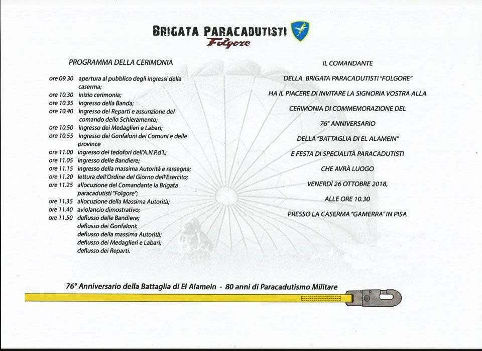 FESTA DI SPECIALITA’ 2018 – Pisa, 26 Ottobre 2018 …per ricordare i nostri Eroi! (Locandina e Programma della celebrazione)
