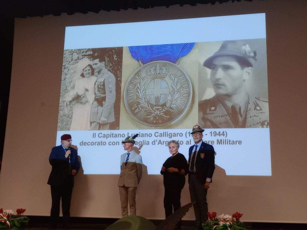 Un momento di particolare emozione ha illuminato la serata: il ricordo del Capitano Luciano Calligaro, Ufficiale dell’8° Alpini, decorato con Croce di Guerra, Medaglia di Bronzo e Medaglia d’Argento al Valor Militare, caduto il 15 agosto 1944, quando la figlia Tea non era ancora nata. Proprio lei, giunta dall’Australia, ha donato al labaro del Gruppo ANA di Buja la Medaglia d’Argento del padre, consegnandola al Generale Giuseppe Montalto, già Comandante del 4° Reggimento Alpini Paracadutisti (Ranger), in rappresentanza ideale di tutti gli Alpini-Paracadutisti d’Italia. Un gesto nobile e toccante, compiuto anche a nome della madre Luciana, oggi centenaria.