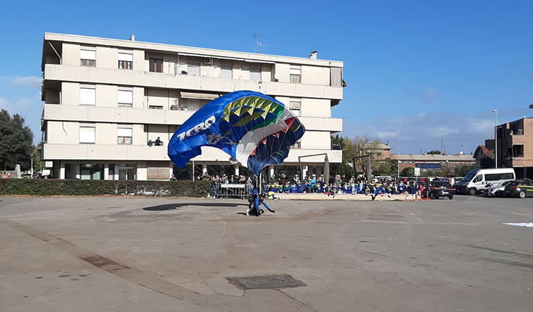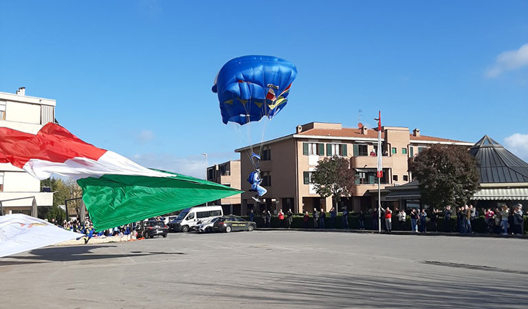 Alla presenza delle Autorità civili e militari – tra cui il Sindaco di Colle Val d’Elsa Dott. Piero Pii; il Comandante del 186° Reggimento Paracadutisti “Folgore”, Col. Salvatore Falcone, accompagnato dal Sottufficiale di Corpo 1° Luogotenente Giuseppe Perillo; i nipoti dell’Eroe, Giovanna e Alberto Comi; il Segretario Generale dell’ANPd’I (Associazione Nazionale Paracadutisti d’Italia), Gen. B. (ris.) Enrico Pollini; il Presidente del Consiglio comunale di Siena dott. Davide Ciacci, in rappresentanza del Sindaco; il Presidente della Sezione provinciale ANPd’I di Siena Maurizio Fabbri; le Associazioni combattentistiche e d’Arma; i labari delle Sezioni ANPd’I di Siena, Livorno e Massa Carrara; oltre a scolaresche di ogni grado e numerosi cittadini – le celebrazioni sono iniziate con uno spettacolare lancio sulla piazza.