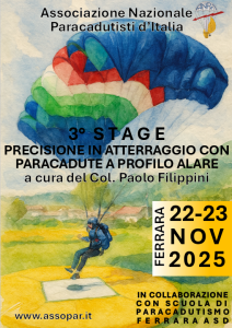E’ stato programmato il 3° stage di avviamento e perfezionamento ai lanci di precisione in atterraggio con paracadute a profilo alare, diretto dal Col. (Ris.) Paolo Filippini.