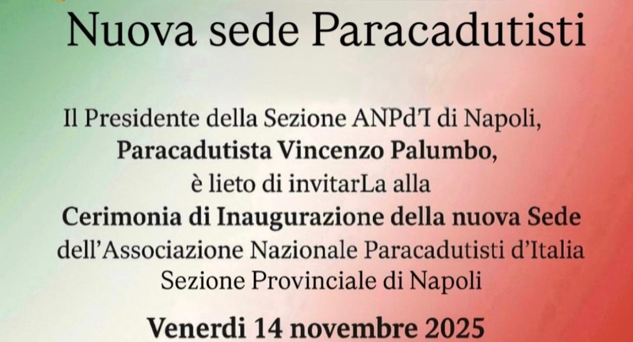 La Sezione ANPd’I di Napoli (Associazione Nazionale Paracadutisti d’Italia) inaugurerà la nuova e prestigiosa sede nel cuore della città partenopea, in via Cesario Console n. 20, a pochi passi da Piazza del Plebiscito. L’appuntamento è per venerdì 14 novembre alle 18,15.