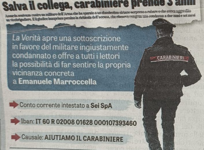 Il quotidiano la Verità ha lanciato sulla pagina del giornale di oggi una campagna di raccolta fondi per aiutare il Vice Brigadiere dei Carabinieri Emanuele Marroccella che il tribunale di […]