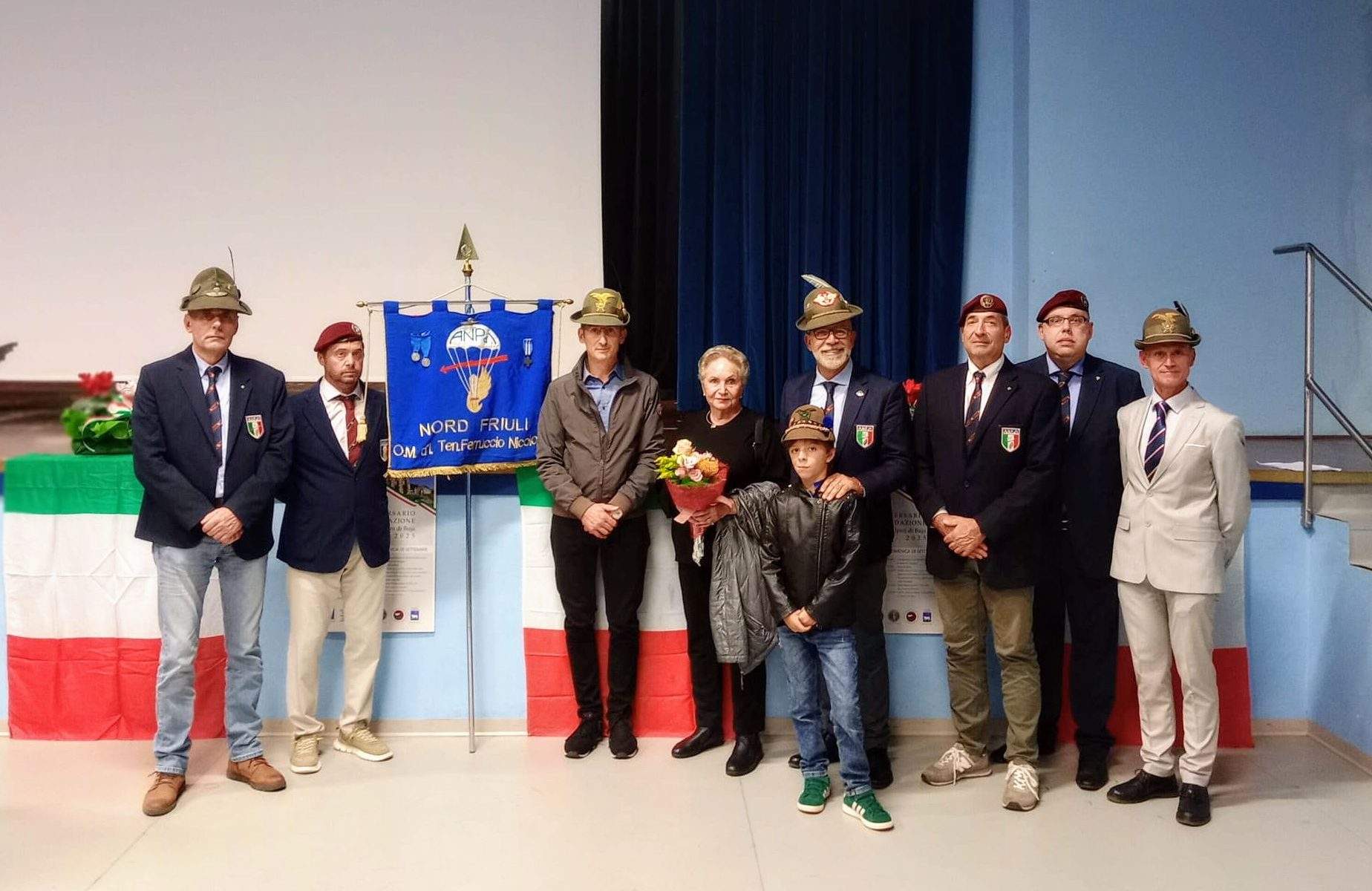 Un momento di particolare emozione ha illuminato la serata: il ricordo del Capitano Luciano Calligaro, Ufficiale dell’8° Alpini, decorato con Croce di Guerra, Medaglia di Bronzo e Medaglia d’Argento al Valor Militare, caduto il 15 agosto 1944, quando la figlia Tea non era ancora nata. Proprio lei, giunta dall’Australia, ha donato al labaro del Gruppo ANA di Buja la Medaglia d’Argento del padre, consegnandola al Generale Giuseppe Montalto, già Comandante del 4° Reggimento Alpini Paracadutisti (Ranger), in rappresentanza ideale di tutti gli Alpini-Paracadutisti d’Italia. Un gesto nobile e toccante, compiuto anche a nome della madre Luciana, oggi centenaria.